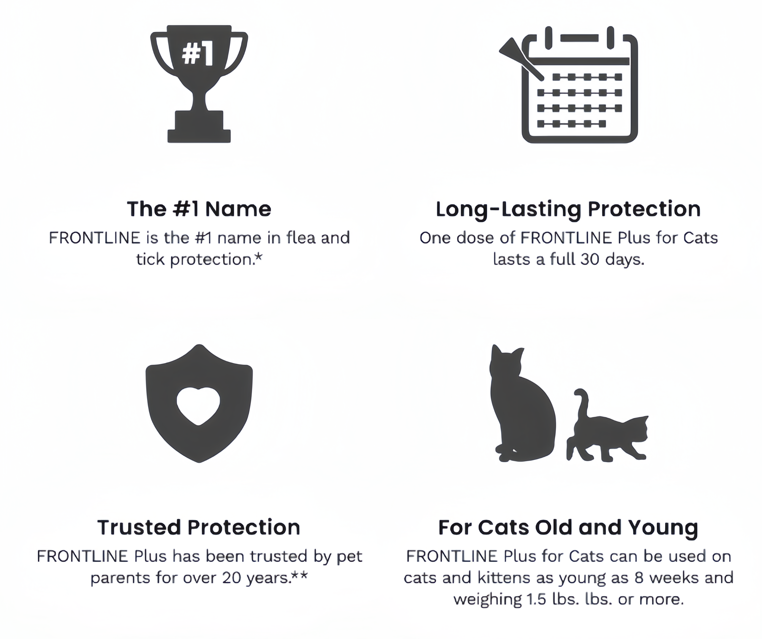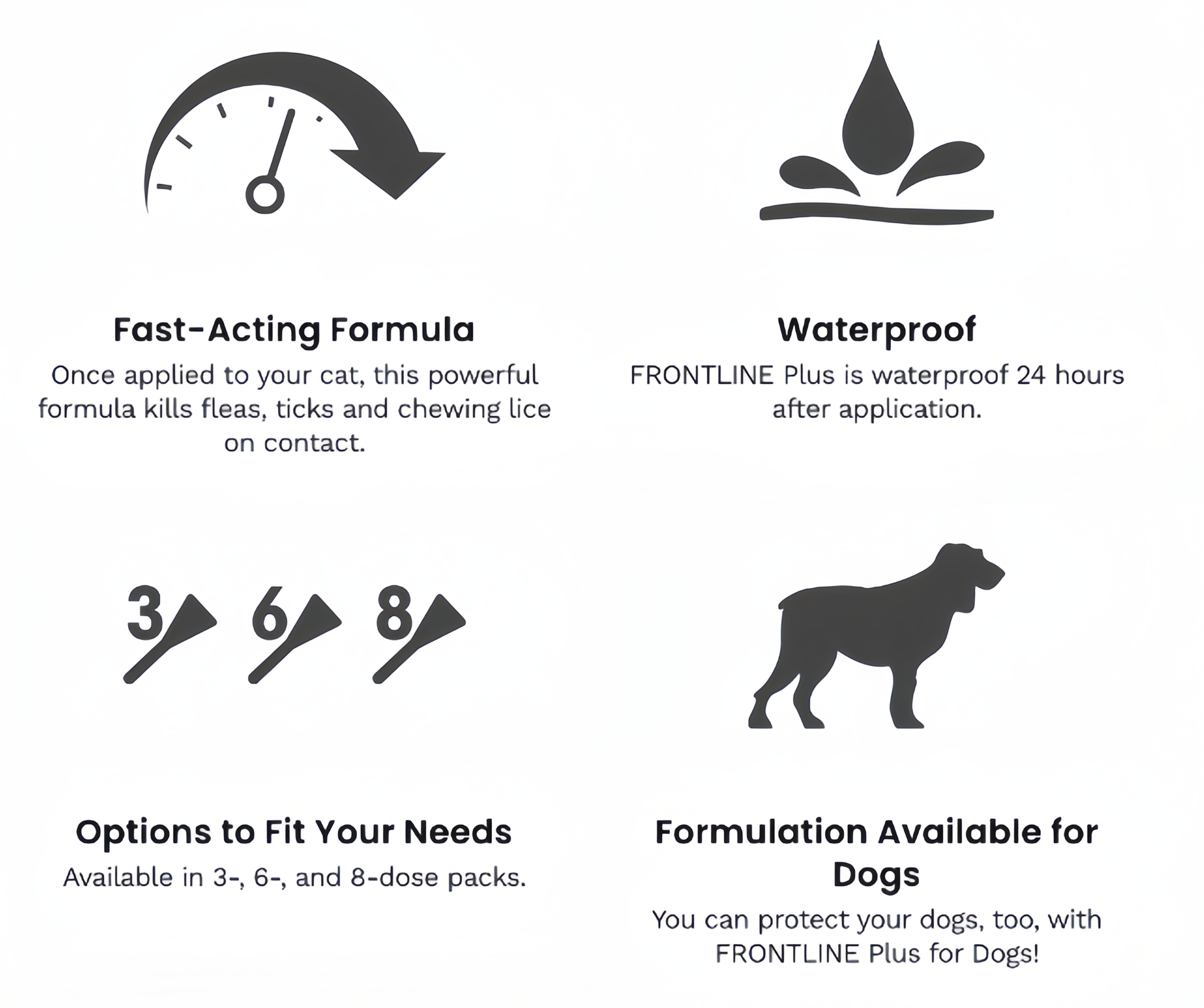 * FRONTLINE Plus flea and tick prevention for cats and kittens is a long-lasting, fast-acting, waterproof flea and tick treatment proven to kill adult fleas, flea eggs, flea larvae, chewing lice and ticks.